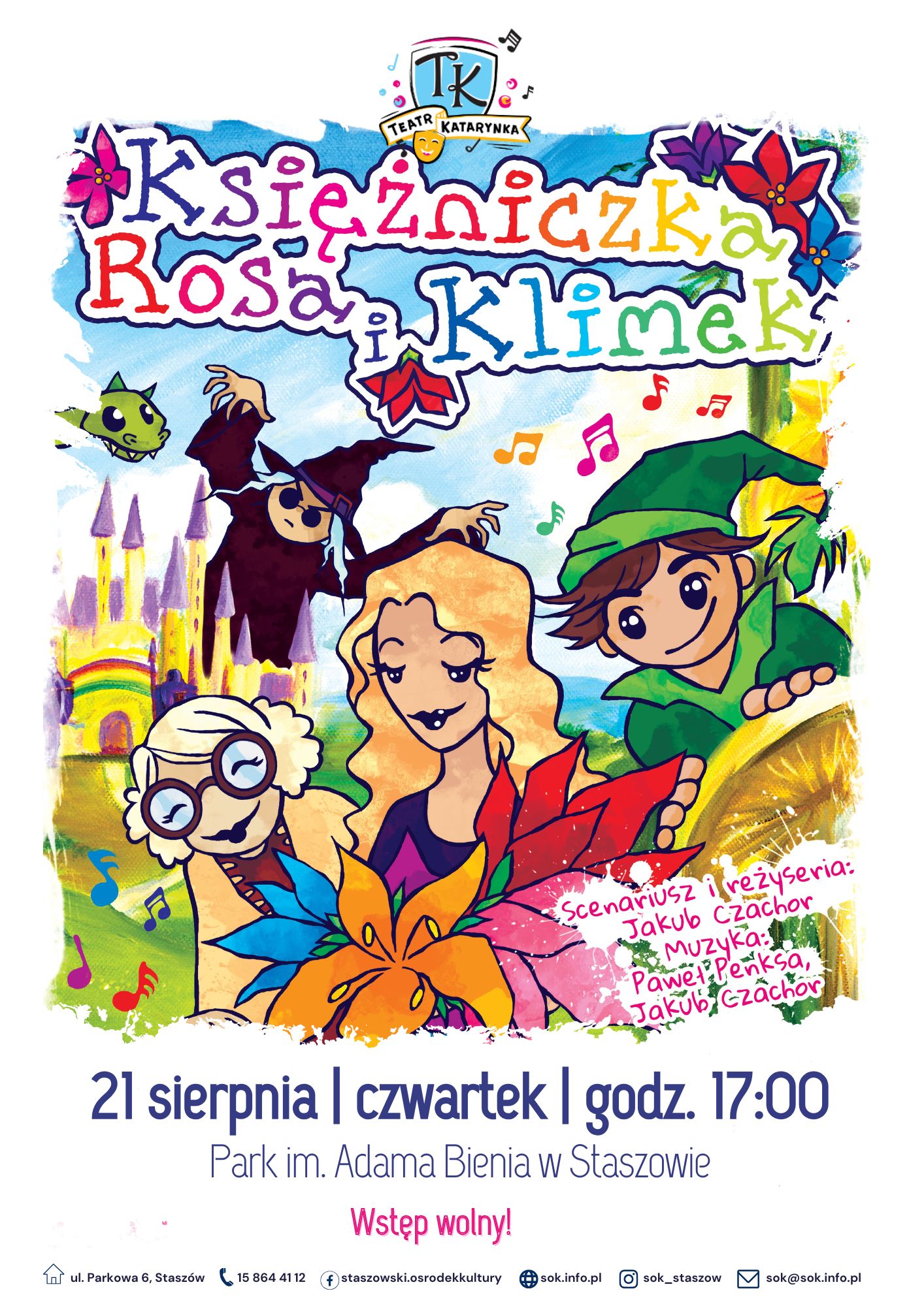 Już 21 sierpnia (czwartek) o godz. 17:00 zapraszamy do Parku im. Adama Bienia na magiczny spektakl plenerowy pt.„Księżniczka Rosa i Klimek” To baśniowa opowieść o dwojgu przyjaciół, którzy stają oko w oko z przebiegłym czarodziejem Zoltanem. Podczas spektaklu najmłodsi odkryją magiczny świat kolorów, a dzięki pełnej energii staruszce – nauczą się zasad dobrego wychowania. Czeka …