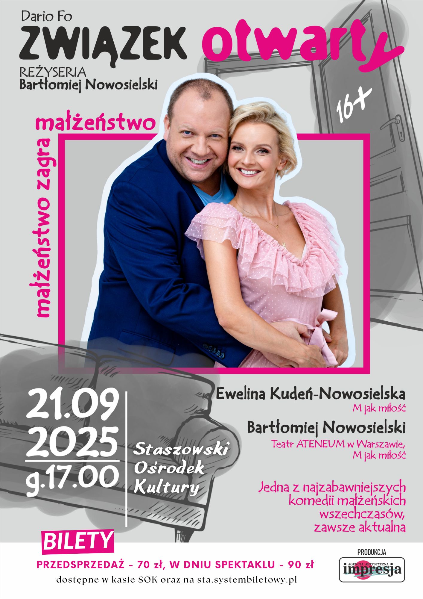 21 września | godz. 17:00 Staszowski Ośrodek Kultury (ul. Parkowa 6) Zapraszamy na pełną humoru i ironii farsę autorstwa Dario Fo – laureata Literackiej Nagrody Nobla – oraz jego żony Franki Rame. „Związek otwarty” to inteligentna i błyskotliwa komedia opowiadająca o małżeństwie… napisana przez małżeństwo. W spektaklu z przymrużeniem oka żongluje się stereotypami dotyczącymi kobiet …