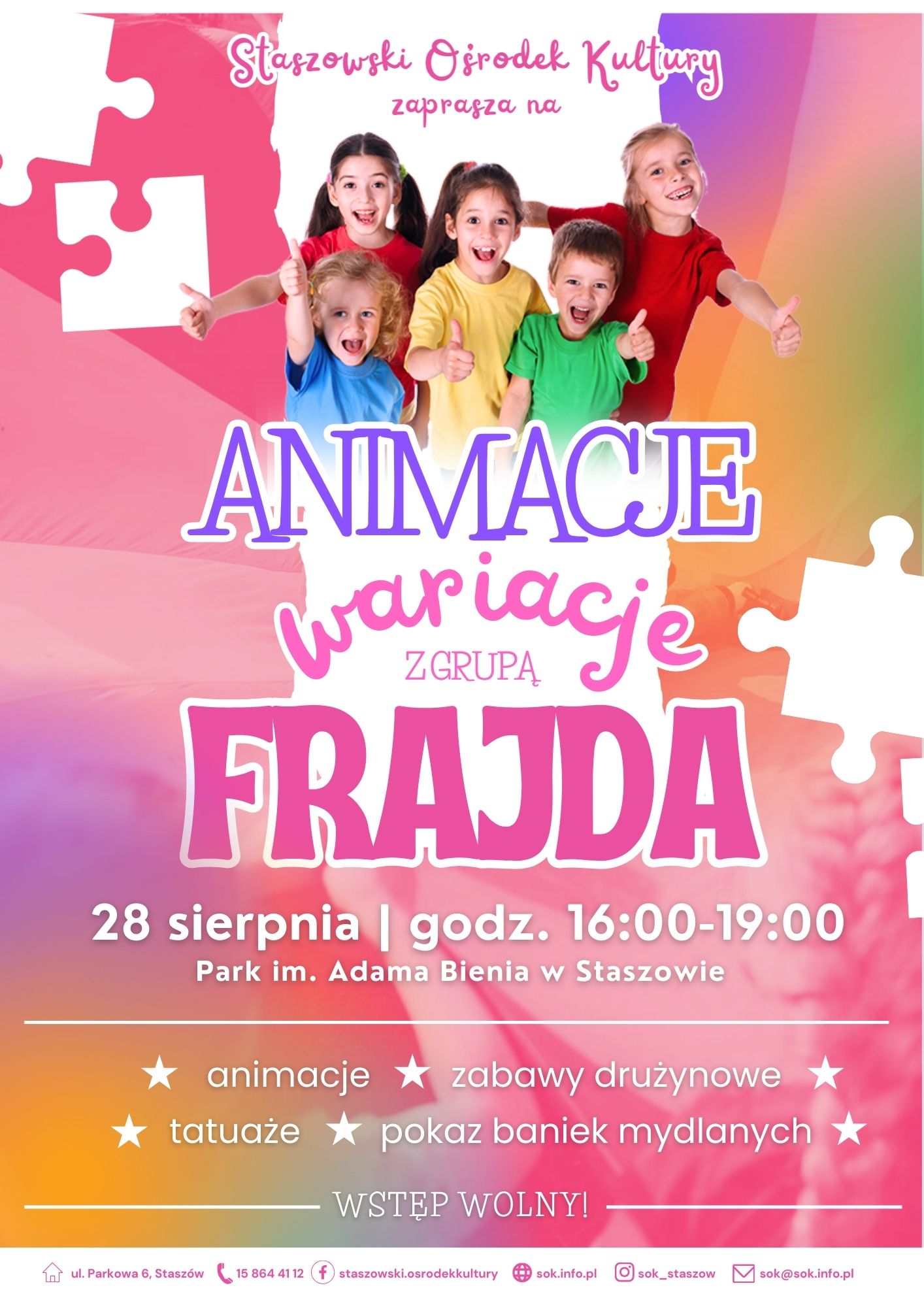 Hej, hej Staszów! Końcówka wakacji wcale nie musi być smutna. 28 sierpnia widzimy się w Parku im. Adama Bienia, gdzie od 16:00 do 19:00 rozkręcamy zabawę razem z grupą „Frajda”! Czekają na Was wesołe animacje, gry i zabawy zespołowe, kolorowe tatuaże oraz magiczny pokaz baniek mydlanych. Będzie mnóstwo śmiechu, ruchu i pozytywnej energii. Do zobaczenia!