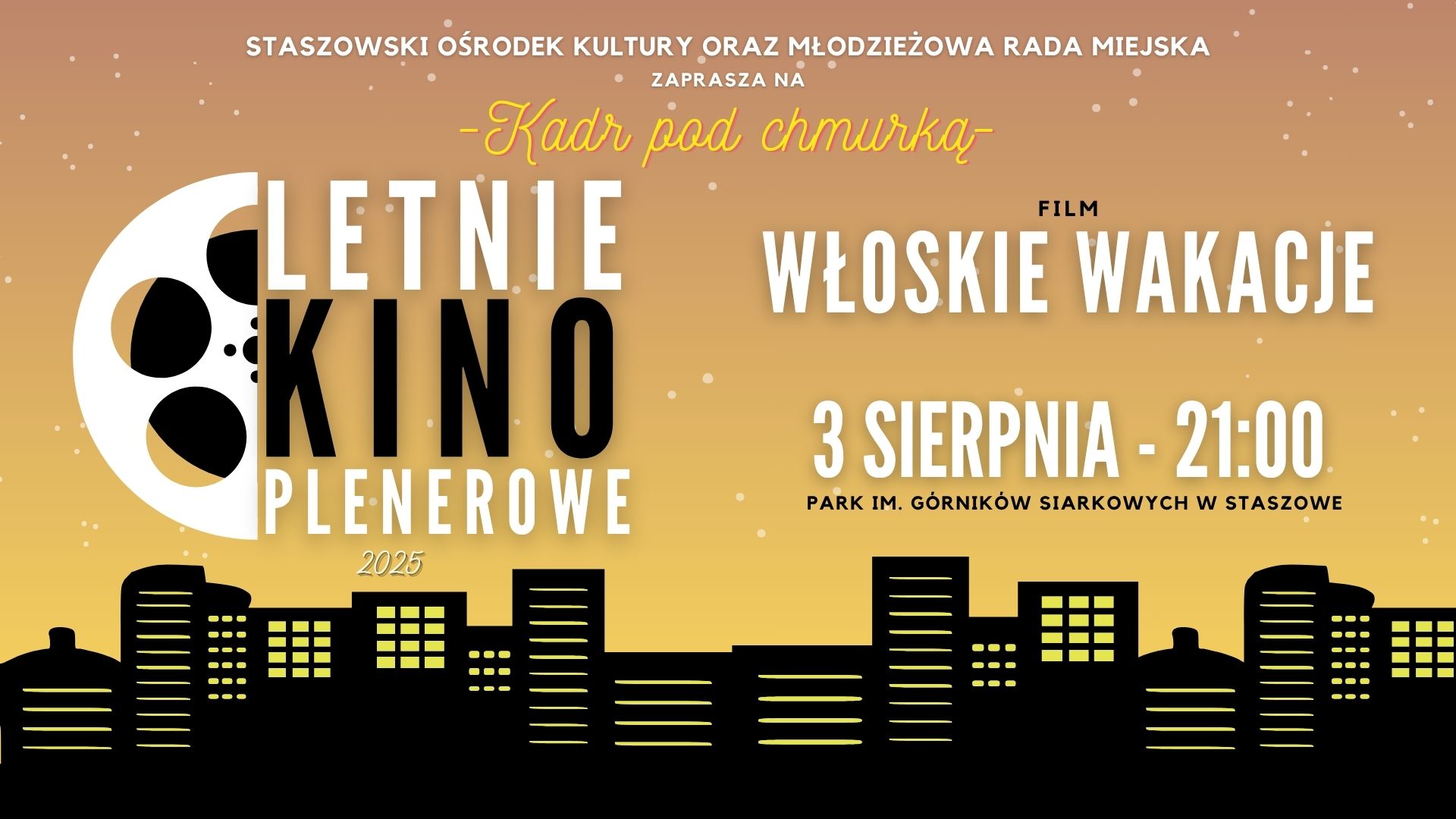 ,,Kadr pod chmurką” z włoskim klimatem Wspólnie z Młodzieżową Radą Miejską zapraszamy na wyjątkowy seans pod gołym niebem! Tym razem przeniesiemy się do słonecznej Toskanii z filmem „Włoskie wakacje” – to pełna ciepła, humoru i pięknych widoków komedia, która rozgrzeje serca i poprawi nastrój. Idealna propozycja na letni wieczór! Park im. Górników Siarkowych w Staszowie …