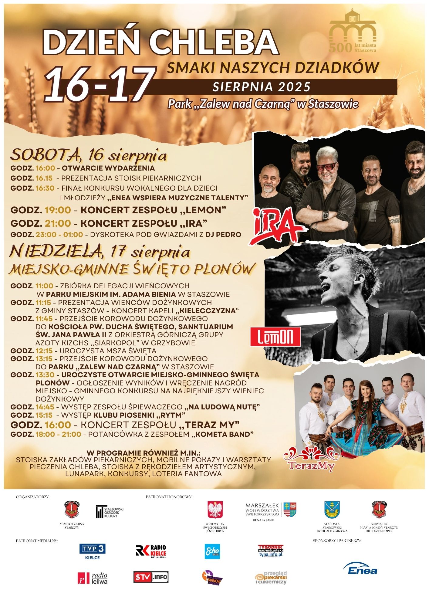 Zapraszamy na Dzień Chleba 2025 – „Smaki Naszych Dziadków”, który odbędzie się w dniach 16–17 sierpnia na terenie Parku „Zalew nad Czarną”. Tegoroczna edycja będzie pełna atrakcji dla całych rodzin – od stoisk z wypiekami, przez koncerty, aż po obrzędy dożynkowe. Na scenie wystąpią m.in. zespoły IRA, Lemon, Teraz My oraz Kometa Band. Nie zabraknie …